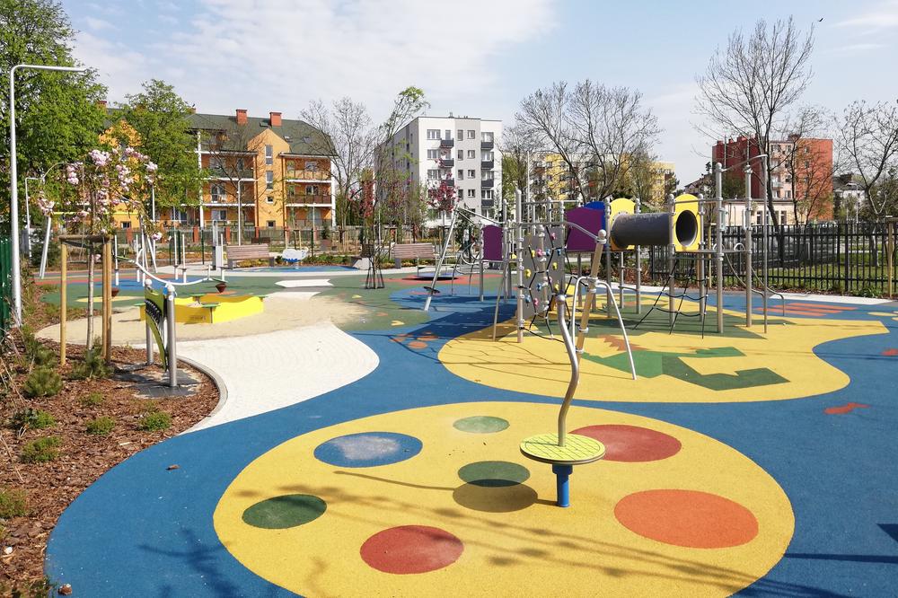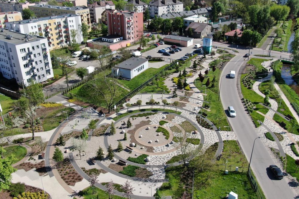 W nowo utworzonym parku o powierzchni 7 tys. m2 posadzono 125 nowych drzew i ponad 9 tys. krzewów, bylin i traw ozdobnych. Najbardziej charakterystycznym elementem parku jest biegnąca środkiem „sucha rzeka” w postaci kamiennej rabaty. Centralny plac zdobią wielkie kamienne kule wykonane ze skał występujących w Polsce: marmuru, piaskowca, dolomitu i granitu. W parku znajduje się również plac zabaw, siłownia plenerowa i stoliki szachowe. W roku 2020 park otrzymał nagrodę „Modernizacja Roku 2019” w kategorii tereny zieleni.