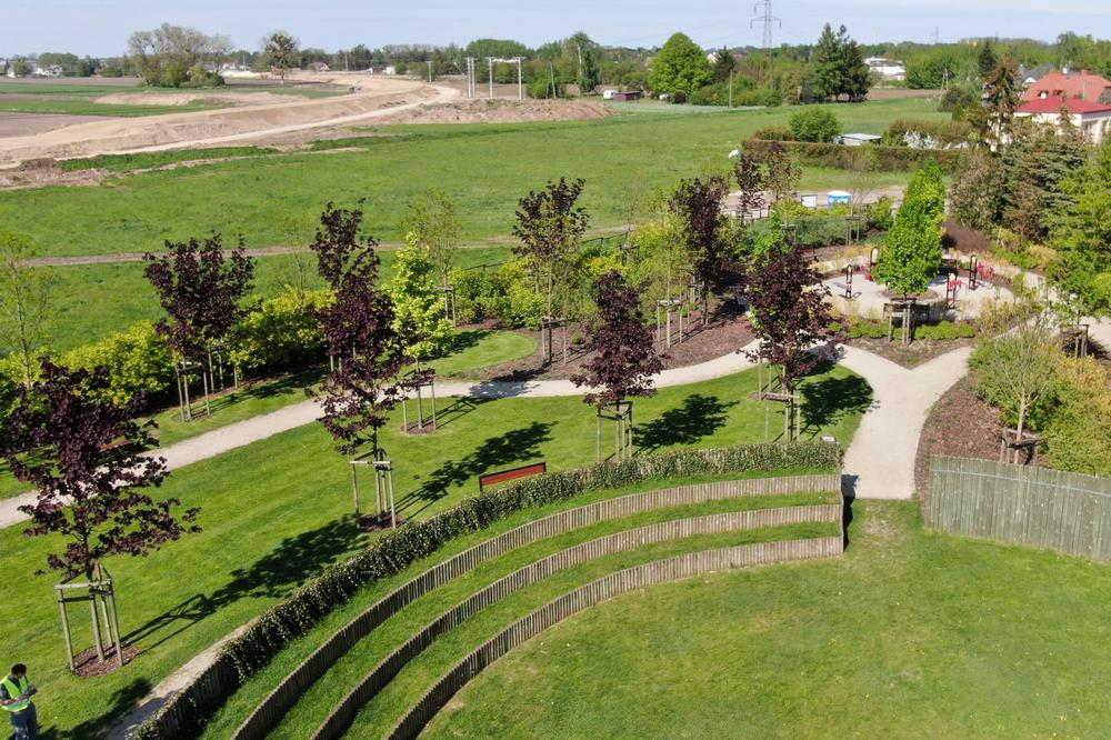 Centralnym elementem nowo utworzonego parku jest w amfiteatr otoczony drewnianą palisadą, stworzony na potrzeby imprez plenerowych. Atrakcją dla dzieci są interaktywne tablice edukacyjne z ciekawostkami na temat gatunków drzew, tropów zwierząt, życia ptaków i owadów, a dla nieco starszych – siłownia plenerowa. W ramach zadania wykonano również przepuszczalne ścieżki piesze o nawierzchni mineralnej i zamontowano elementy małej architektury. Na powierzchni 5,3 tys. posadzono 74 szt. drzew oraz ponad 4 tys. krzewów i bylin. Ponad 2,5 tys. m2 zajmują trawniki, które służą jako tereny piknikowe.