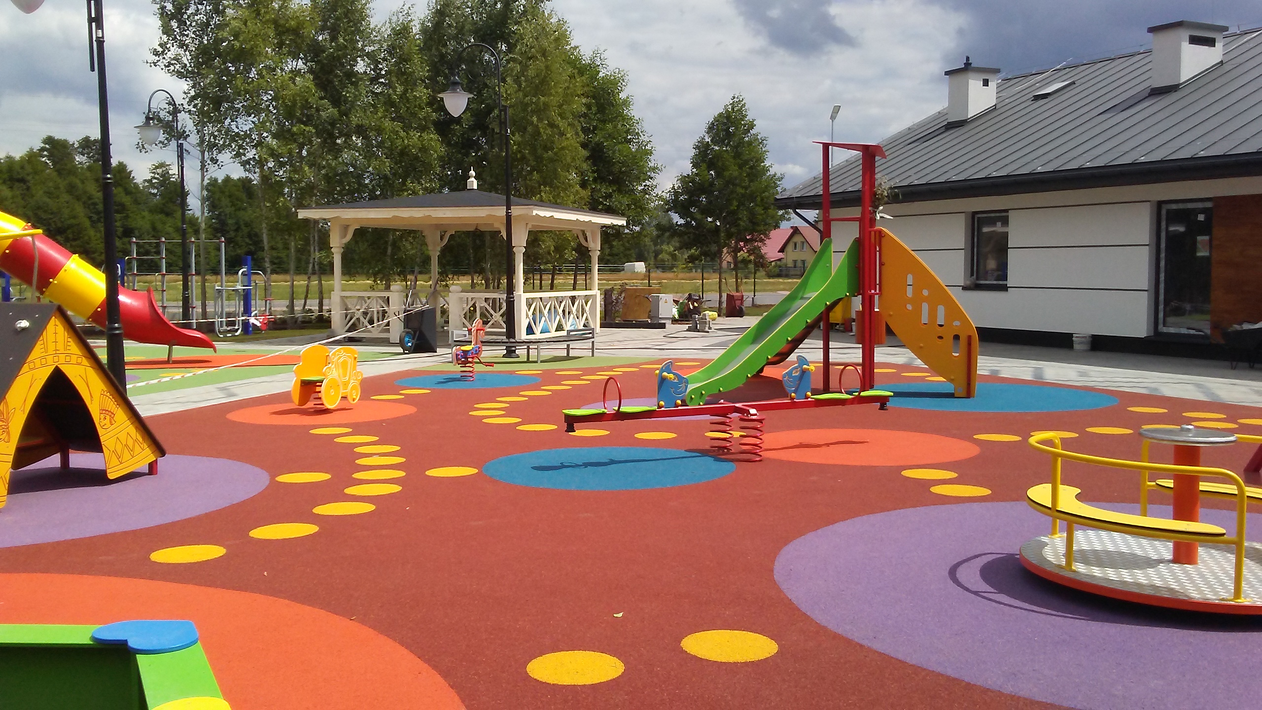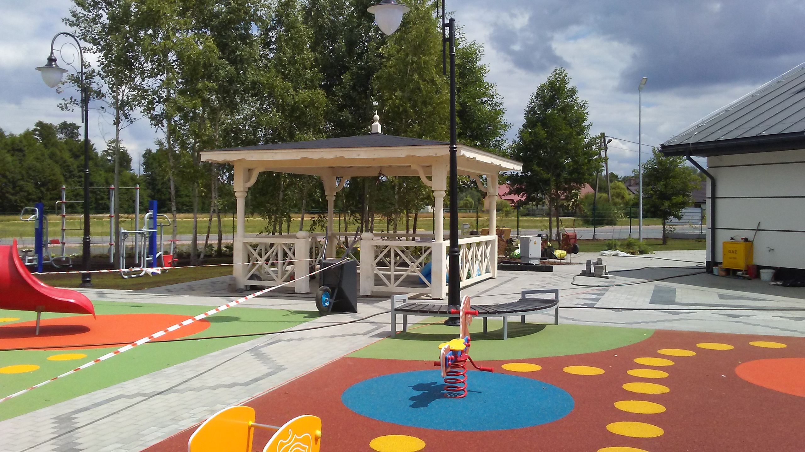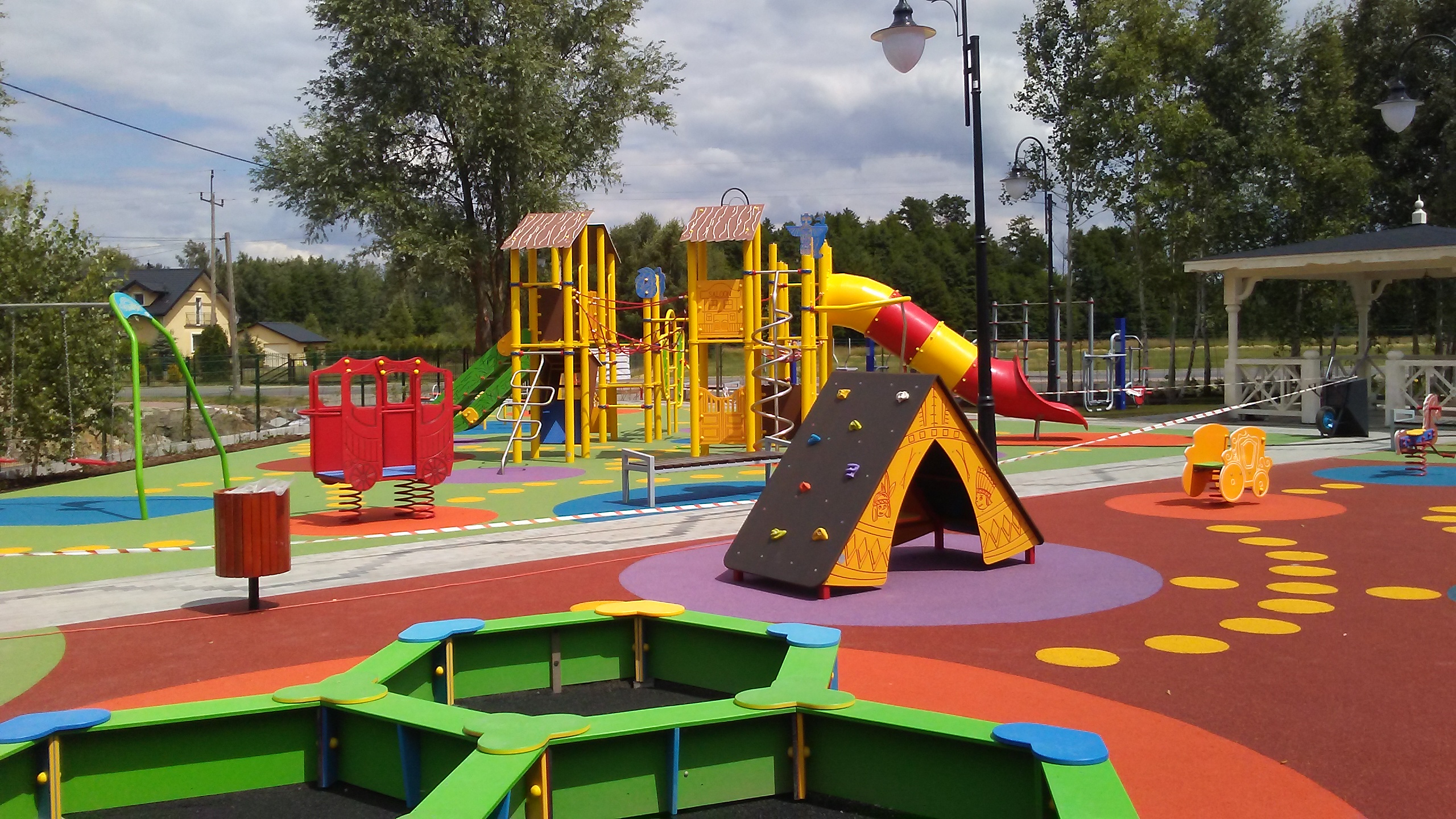 •  budowę placu zabaw z podziałem dla dzieci młodszych i starszych. Projekt przewiduje pokrycie (utwardzenie) całego placu zabaw syntetyczną nawierzchnią EPDM, której zadaniem jest amortyzacja upadku dziecka z wysokości. Rodzaj i grubość nawierzchni została dostosowana do parametrów WSU/HIC (wysokość swobodnego upadku/head injury criteria) określonych dla poszczególnych urządzeń zabawowych. Zastosowanie tego typu nawierzchni jest sprawdzonym i powszechnie stosowanym rozwiązaniem na placach zabaw. W strefie dzieci młodszych zaprojektowano kilka urządzeń zabawowych tj. huśtawka sprężynowa o motywie „konik” i „kareta”, piaskownica potrójna (3 pola piaskownicy), huśtawka sprężynowa i wahadłowa z siedziskiem typu „gniazdo”, zabawka domek o motywie „indiańska chata”, karuzela, zjeżdżalnia podwójna.