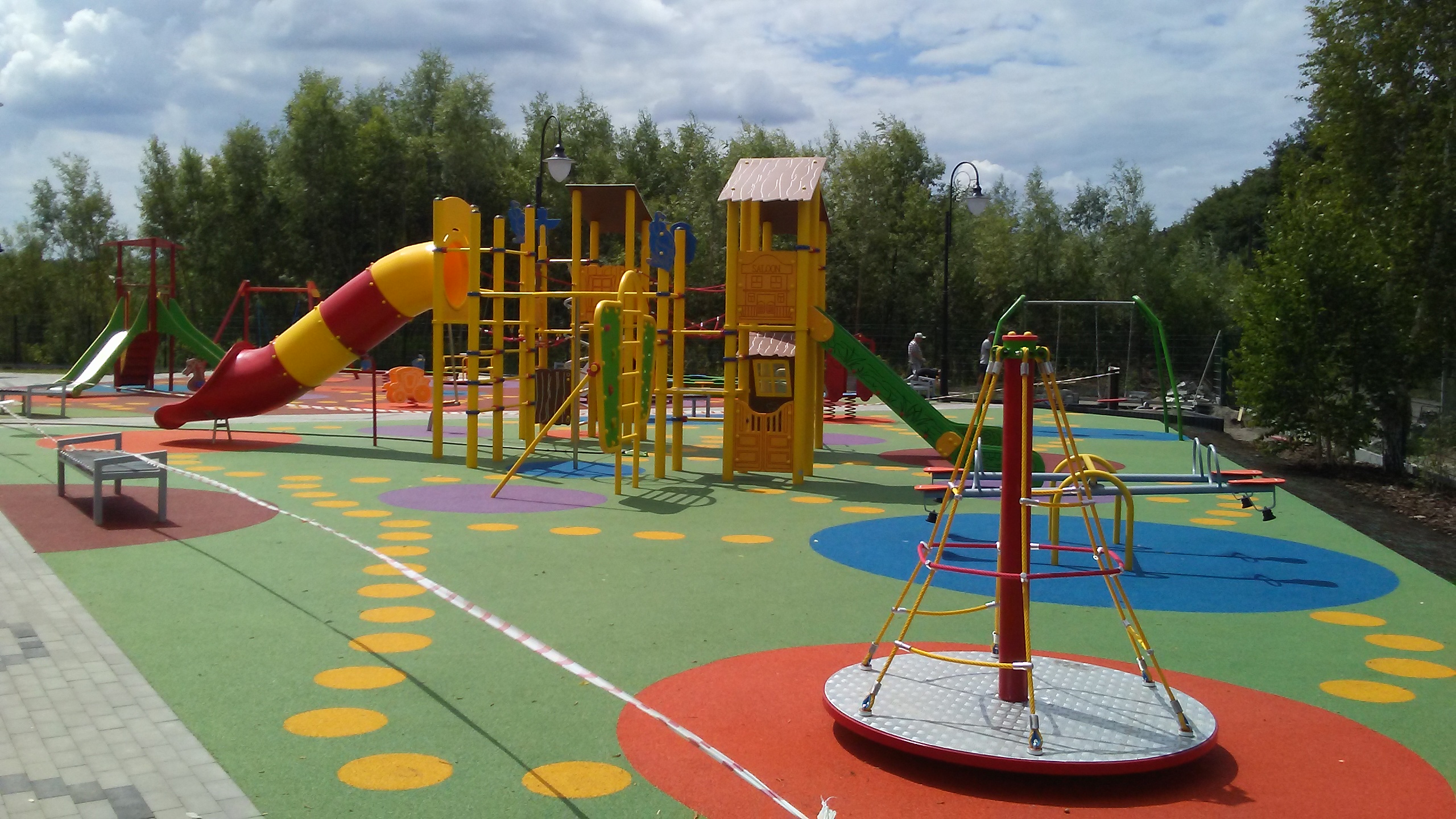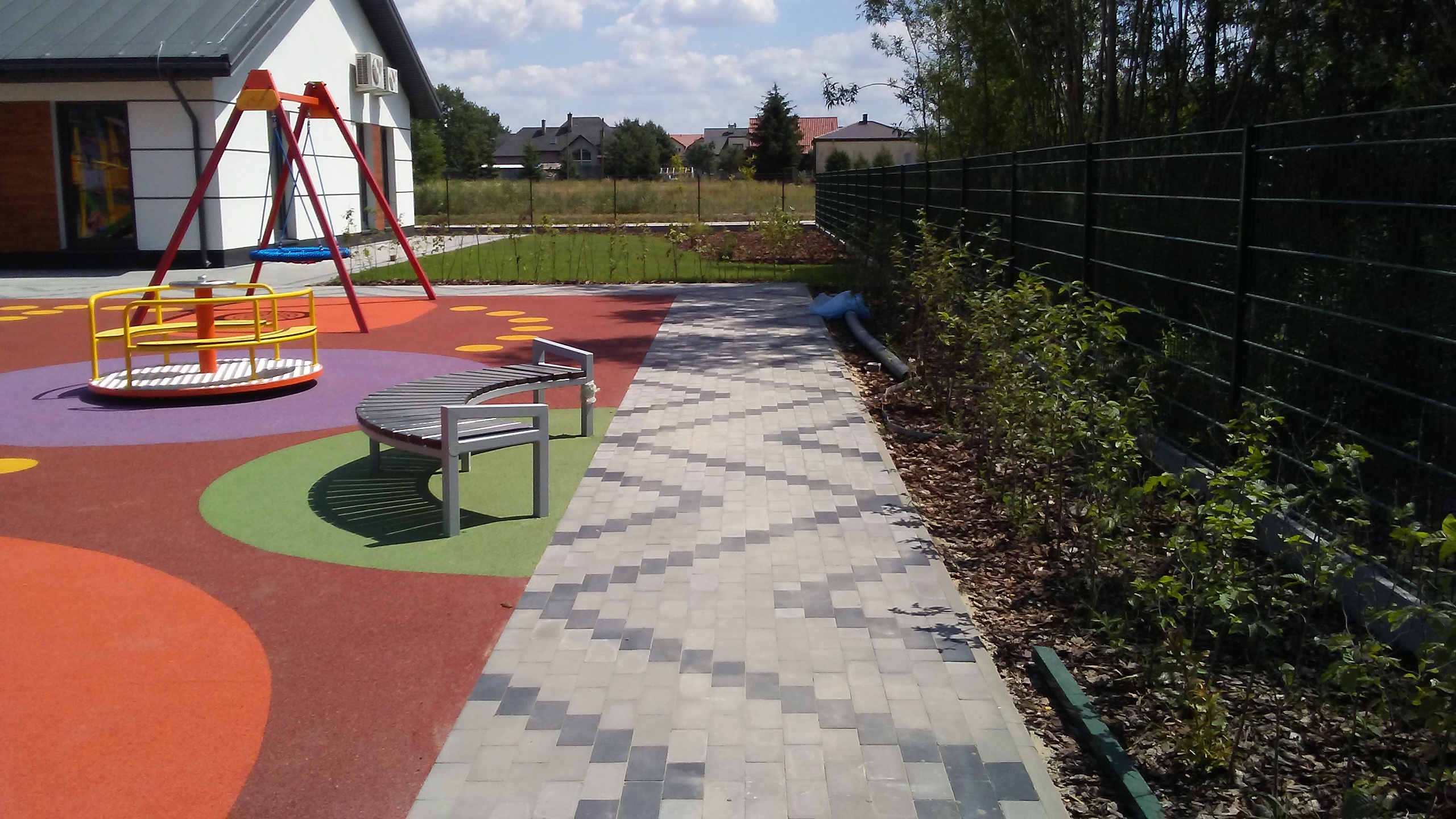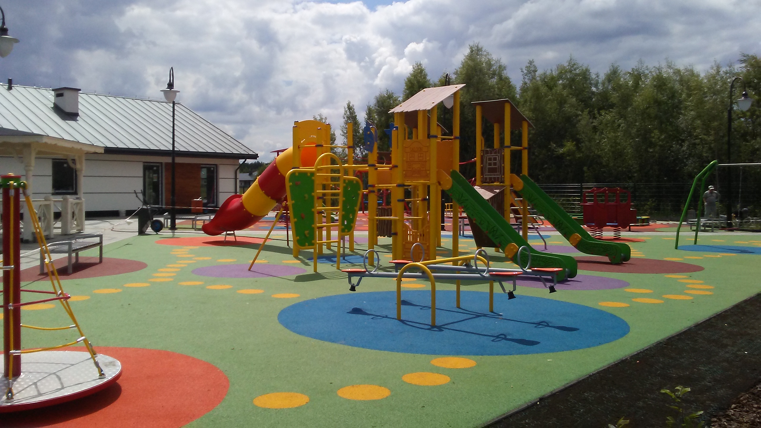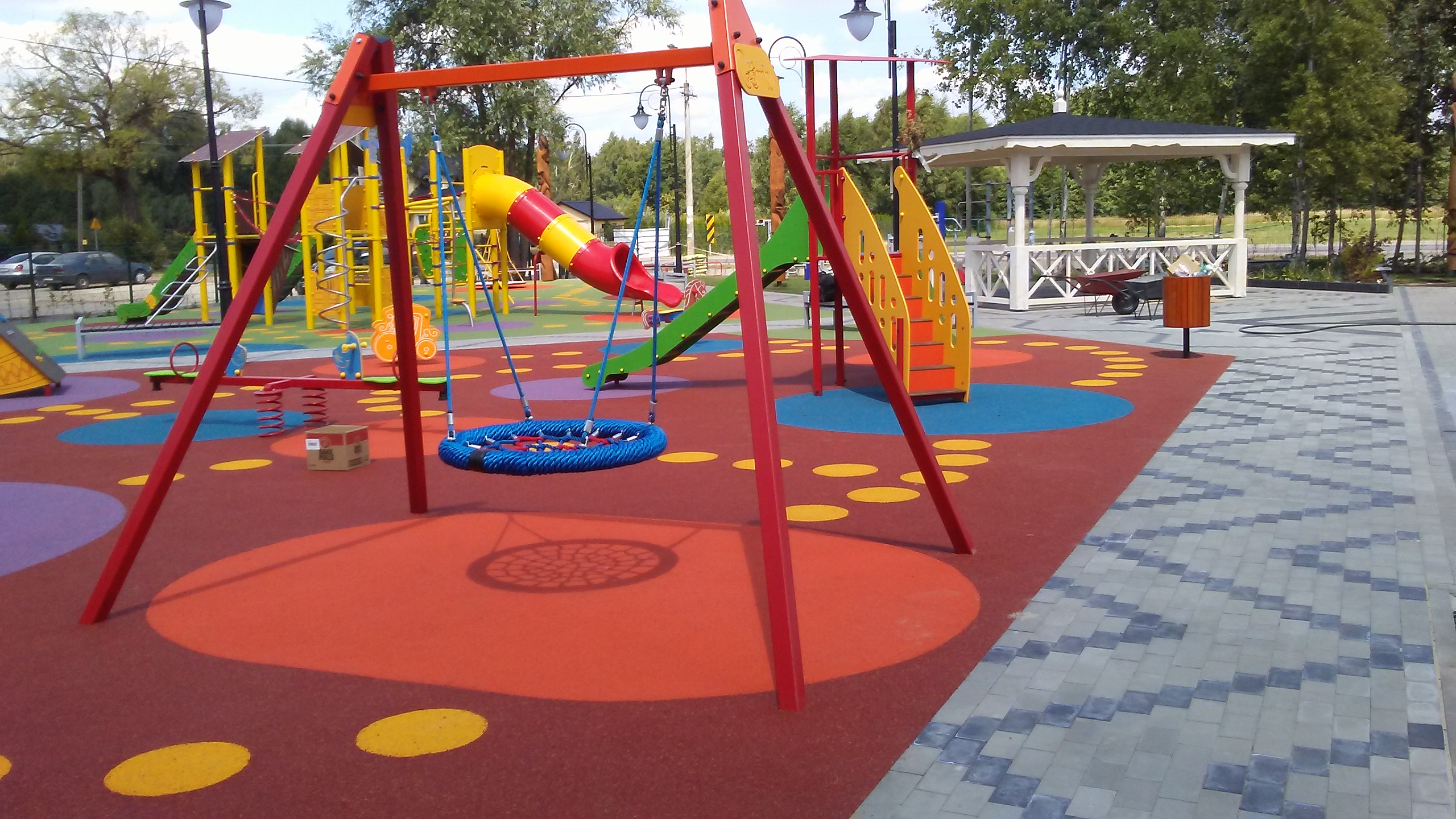 •  budowę placu zabaw z podziałem dla dzieci młodszych i starszych. Projekt przewiduje pokrycie (utwardzenie) całego placu zabaw syntetyczną nawierzchnią EPDM, której zadaniem jest amortyzacja upadku dziecka z wysokości. Rodzaj i grubość nawierzchni została dostosowana do parametrów WSU/HIC (wysokość swobodnego upadku/head injury criteria) określonych dla poszczególnych urządzeń zabawowych. Zastosowanie tego typu nawierzchni jest sprawdzonym i powszechnie stosowanym rozwiązaniem na placach zabaw. W strefie dzieci młodszych zaprojektowano kilka urządzeń zabawowych tj. huśtawka sprężynowa o motywie „konik” i „kareta”, piaskownica potrójna (3 pola piaskownicy), huśtawka sprężynowa i wahadłowa z siedziskiem typu „gniazdo”, zabawka domek o motywie „indiańska chata”, karuzela, zjeżdżalnia podwójna.